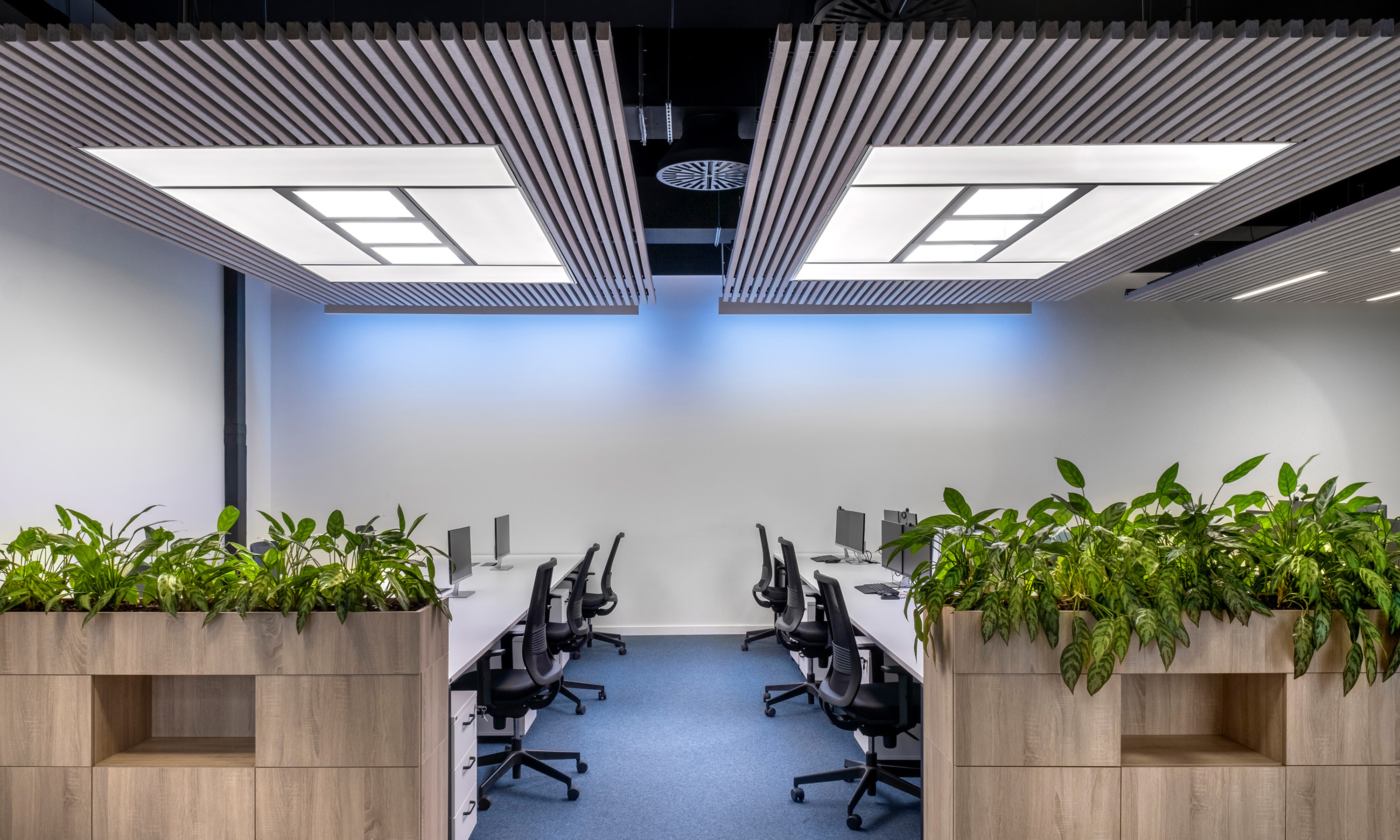 This strategic alignment guided a design direction that intentionally merges modern workplace logic with the raw, honest features of an industrial environment. Exposed ceilings, visible mechanical systems, and structural lines anchor the industrial base, while clean geometries, curated materiality, and tailored lighting craft a contemporary, forward-looking workspace. A defining layer of the design is the use of NatureConnect by Signify to support visual quality, precision, and focus on engineering-driven tasks. Meeting rooms defined by fabric curtains introduce visual softness without losing the identity of the exposed ceiling. Beyond spatial design, large-scale environmental graphics integrate brand messaging with texture and materiality, reinforcing engineering values while becoming an architectural element within the space. Together, these choices create a balance between the company’s production DNA and its modern work culture.